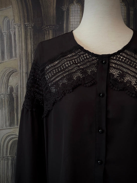 Victorian Inspired Black Chiffon Lace Inset Chemise Blouse - Size L-XL