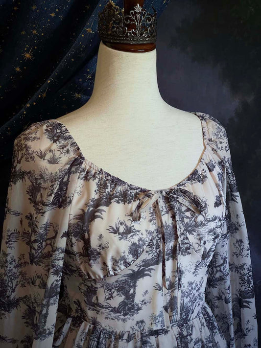 Historically Inspired Blue Toile Print Bishop Sleeve Mini Dress