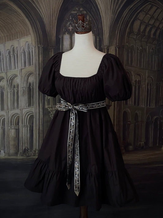 Victorian & Regency Inspired Gothic Puff Sleeve Mini Dress in Black Cotton