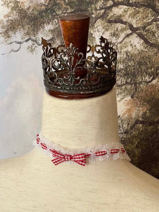 Countryside Gingham Ribbon & Lace Choker Necklace in Red x White