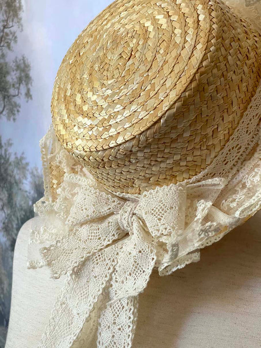 Victorian & Edwardian Straw Boater Hat with Floral Crochet Lace Details
