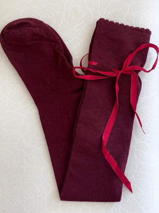 Historically Inspired Cotton Knee-High Socks with Ribbon Lacing in Burgundy