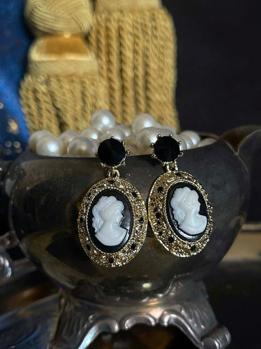 Historically Inspired Gothic Filigree Cameo Earrings in Black x Gold
