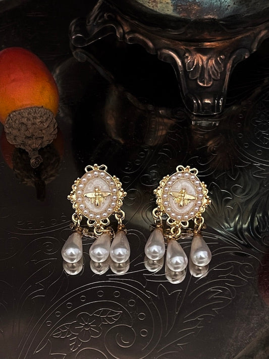 Regency Inspired Bee Cameo Earrings with Pearl Dangles - White & Gold