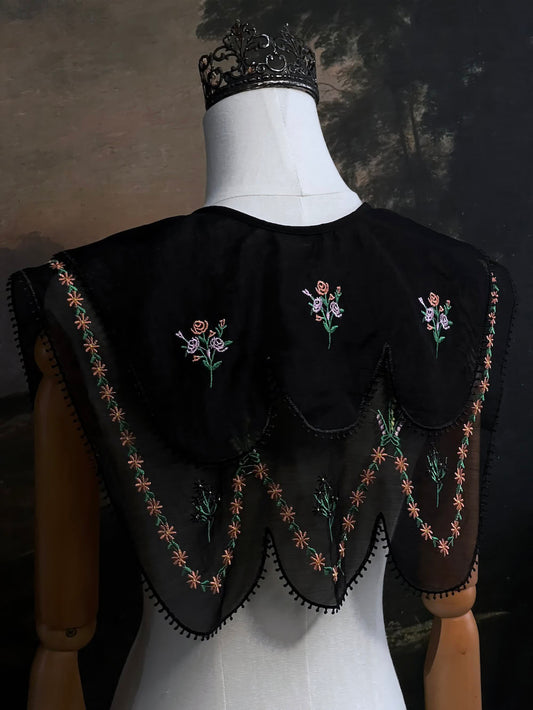 Historically Inspired Wild Flower Embroidered Collar Capelet in Black