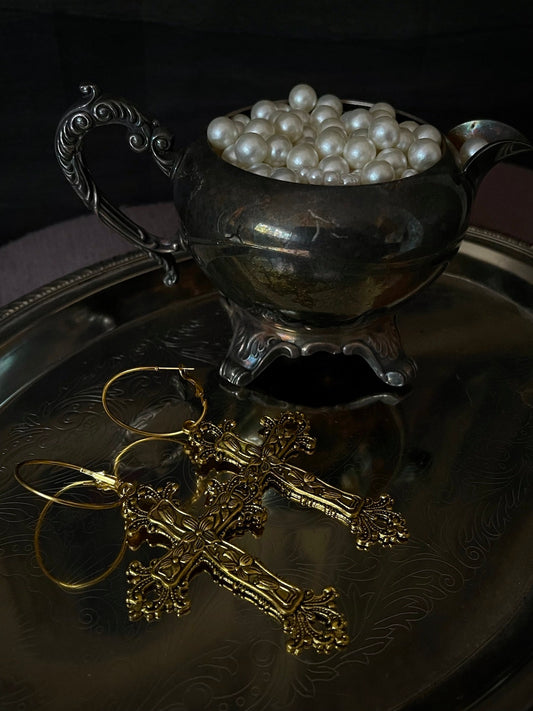 Historically Inspired Large Ornate Metal Cross Earrings in Gold