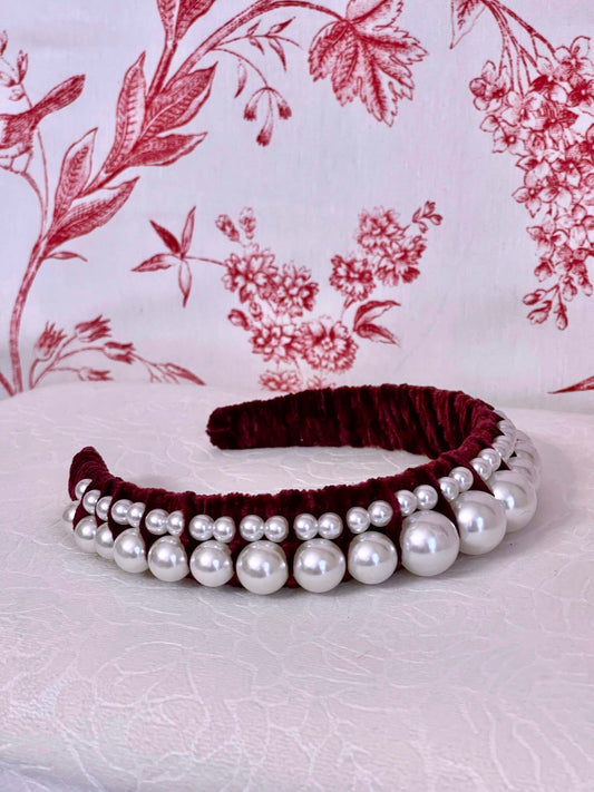 Historically Inspired French Hood Style Velvet Pearl Headband in Burgundy