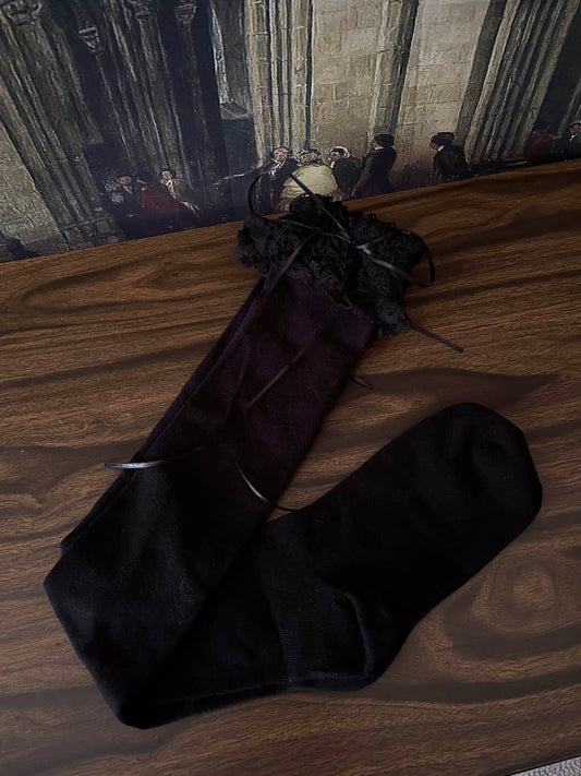 Historically Inspired Cotton Knee-High Socks with Lace Trim in Black