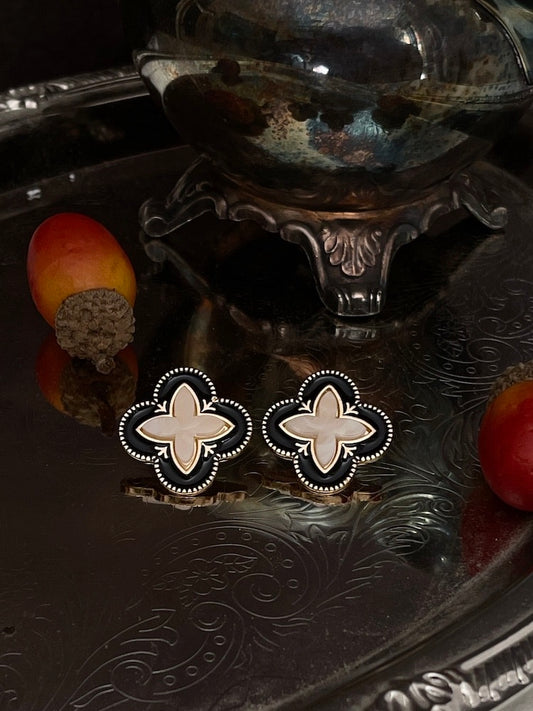 Historically Inspired Renaissance Quatrefoil Stud Earrings in Black x Ivory