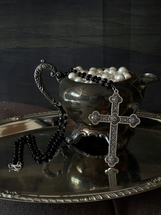 Medieval Gothic Metal Cross Beaded Necklace in Black and Silver