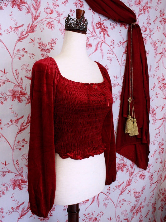 Historically Inspired Red Velvet Smocked Blouse with Rosette Bow Applique