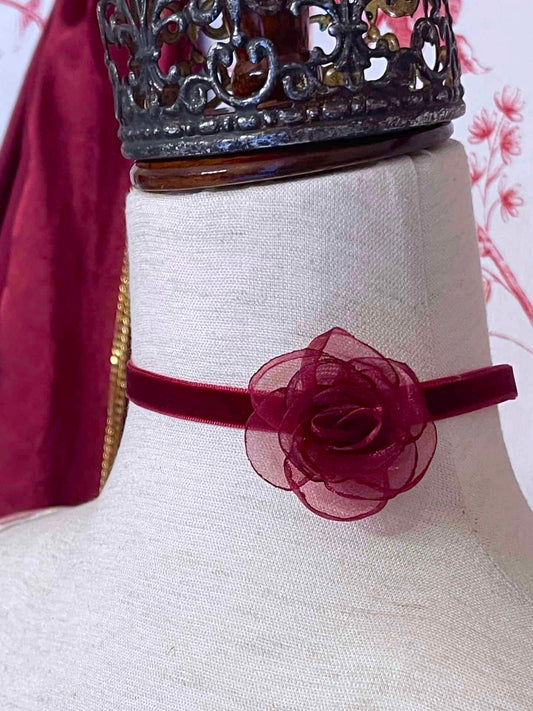 Historically Inspired Velvet Ribbon Rosette Choker Necklace in Burgundy