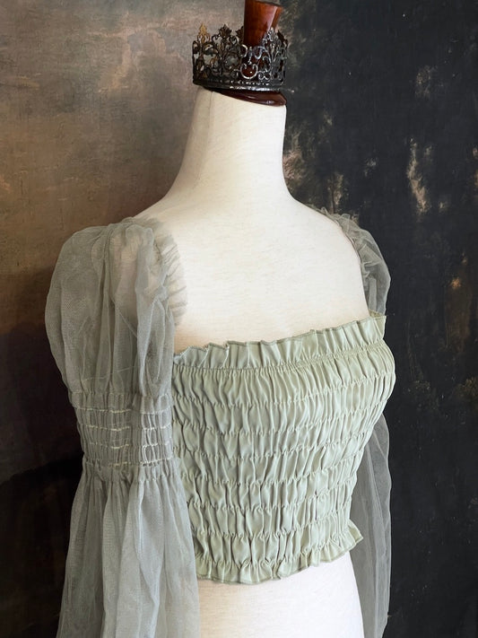 Historically Inspired Sheer Juliet Sleeve Smocked Blouse in Sage Green