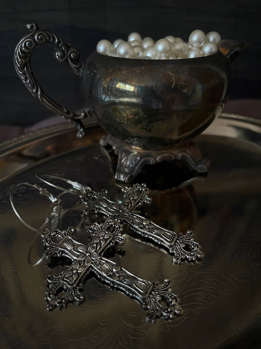 Historically Inspired Large Ornate Metal Cross Earrings in Silver