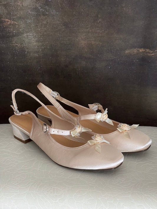 Regency & Rococo Inspired Satin Slipper Heels with Rosette Appliques in Champagne