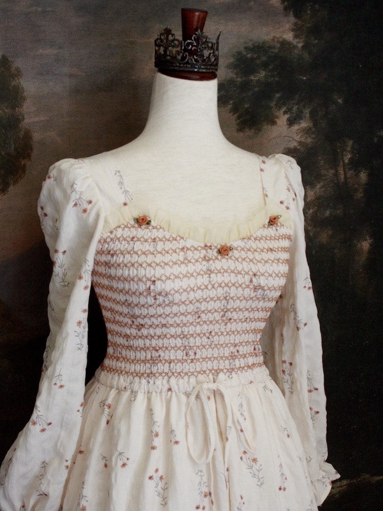 This Historically Inspired Smocked Tea Gown will make any occasion special. It features a delicate color palette of cream with peach-pink contrast stitching, a fully smocked bodice, long billowy bishop sleeves, floral print throughout, and is finished with ruffle trim and peach rosette appliques. Perfect for a Regency era promenade, or afternoon tea!